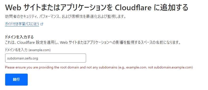 写真のようにCloudflareにはサブドメイン(subdomain.seifu.org)などは追加できず、ルートドメイン(seifu.orgなど)である必要があります。