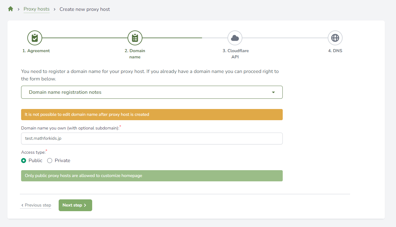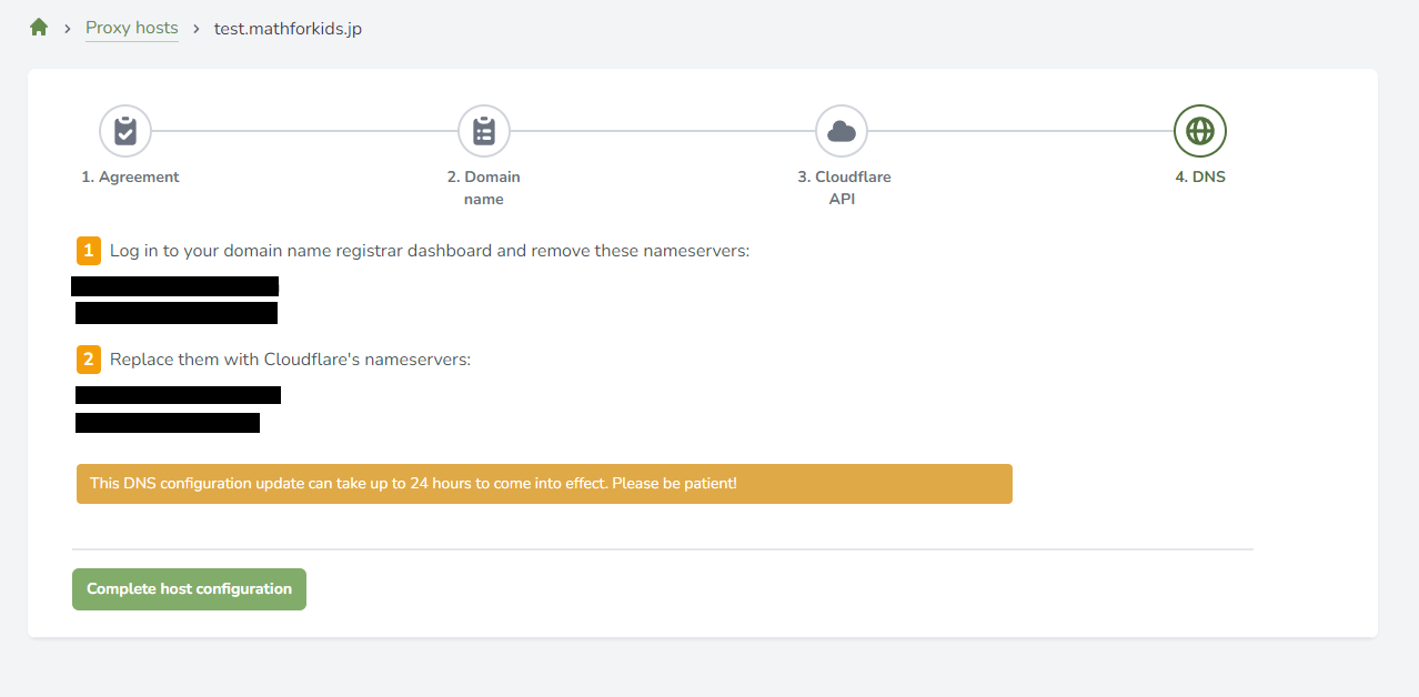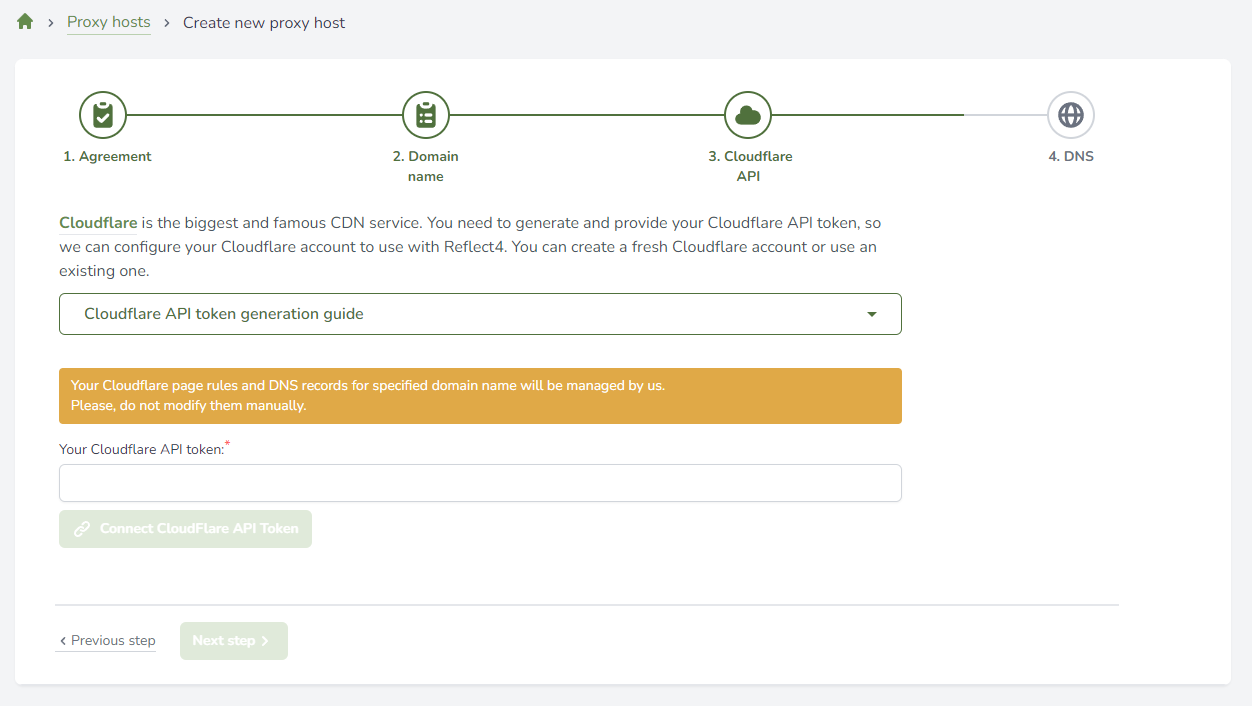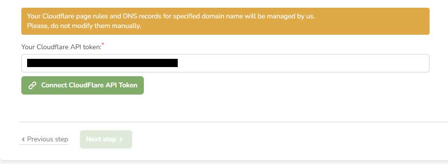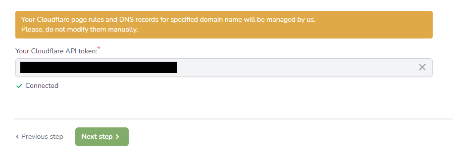 入力後に“Connect Cloudflare API Token”を押し“Next step”を押して次に進みます。