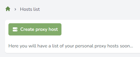 ログイン後、このページになると思いますが左上の“Create proxy host”のボタンを押します。