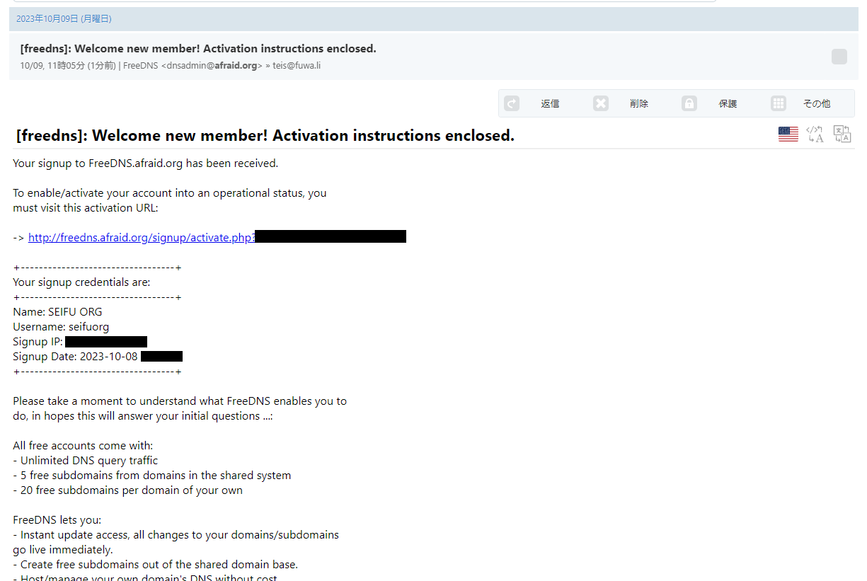 このようなメールの“http://freedns.afraid.org/signup/activate.php?”というリンクをクリックします。